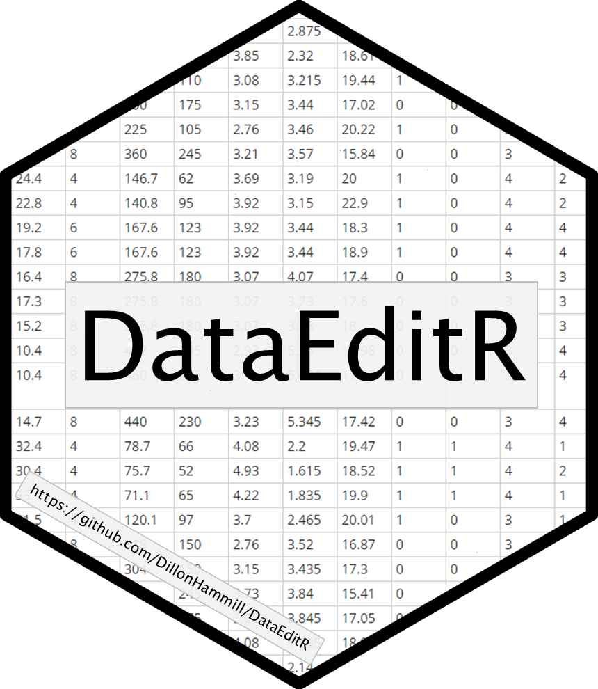 Manual data entry and editing in R can be tedious, especially if you have limited coding experience and are accustomed to using software with a Graphical User Interface (GUI). DataEditR is an R package that makes it easy to view, enter and edit data within R, due to its convenient interactive GUI that supports many of the data manipulation operations supported by other commonly used GUI-oriented software. If you are new to DataEditR visit https://dillonhammill.github.io/DataEditR/ to get started.